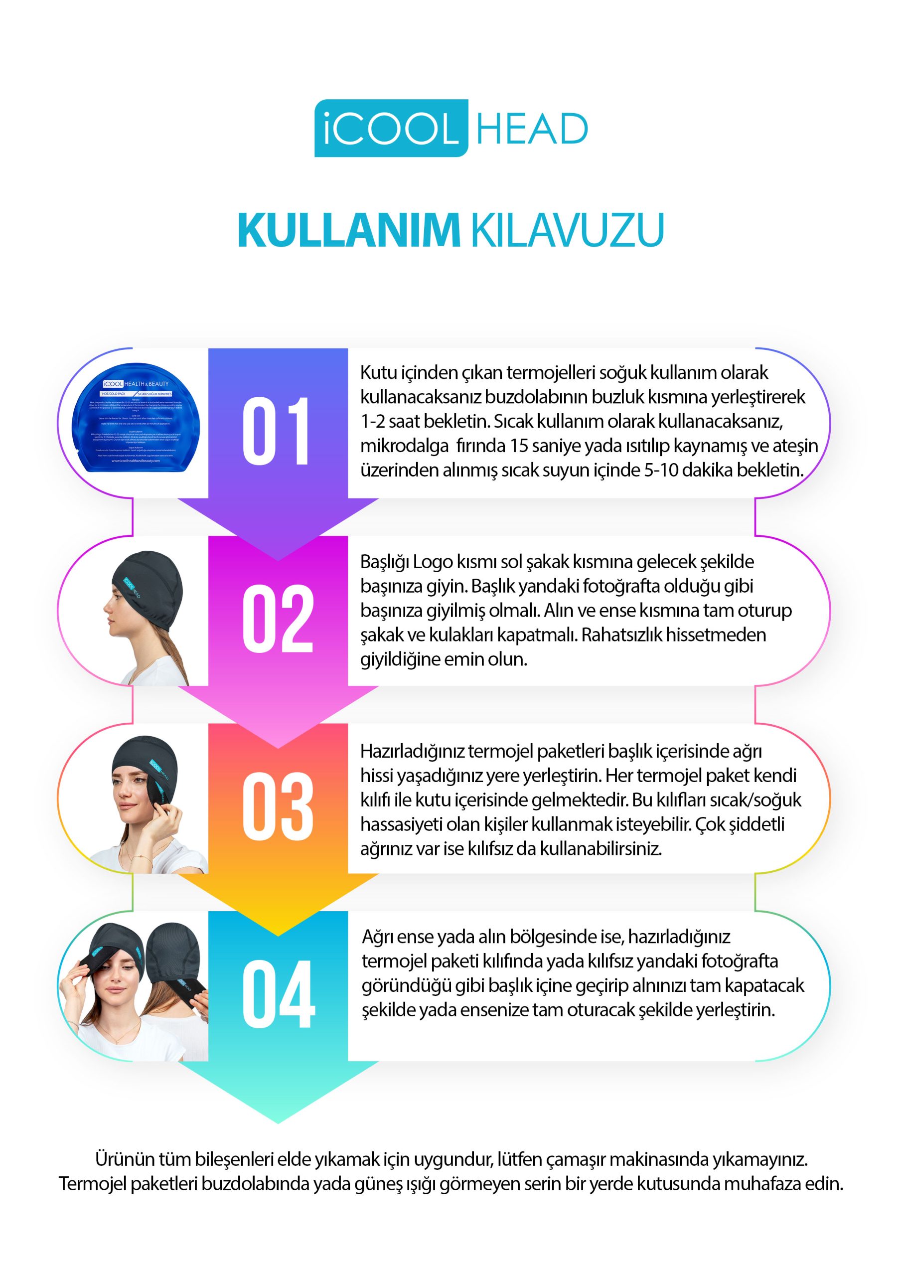 - iCool Head Ağrı Giderici Başlık, sadece ağrı yaşadığınız bölgenize özel termojel paketler kullanarak günlük yaşantınıza konfor katıyor. Bu başlığı ev işlerinizi yaparken ya da iş yerinizde çalışırken rahatlıkla kullanabilirsiniz.